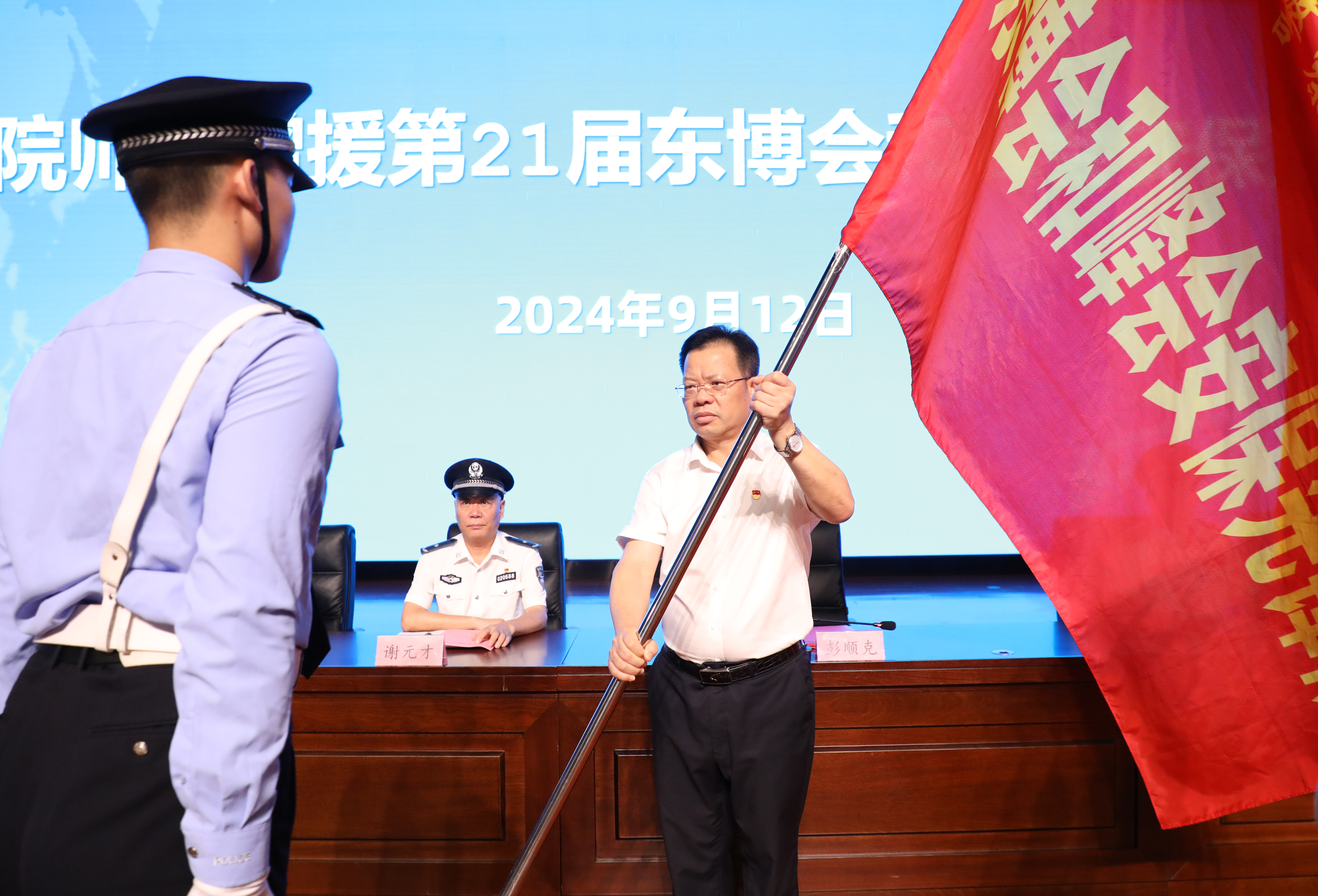 会上,彭顺克为参战队伍授旗。彭顺克对参战师生提出3点要求,一是胸怀“国之大者”,增强安保工作使命感,坚决打赢安全保卫这场政治战、攻坚战,努力为服务新质生产力发展、中国—东盟自贸区3.0版建设和区域高质量增长作出警院人的贡献和担当。二是坚守战斗岗位,严格落实安全保卫任务,以高质量的安全保卫助力第21届东博会、峰会办出特色、办出水平、办出实效。三是严格工作纪律,树立“警院人”良好形象,服从命令、听从指挥、文明执勤、依法办事,坚决执行好各项纪律要求和流程规范,展现良好的警容风纪、良好素质和“创人民满意公安”的精气神。