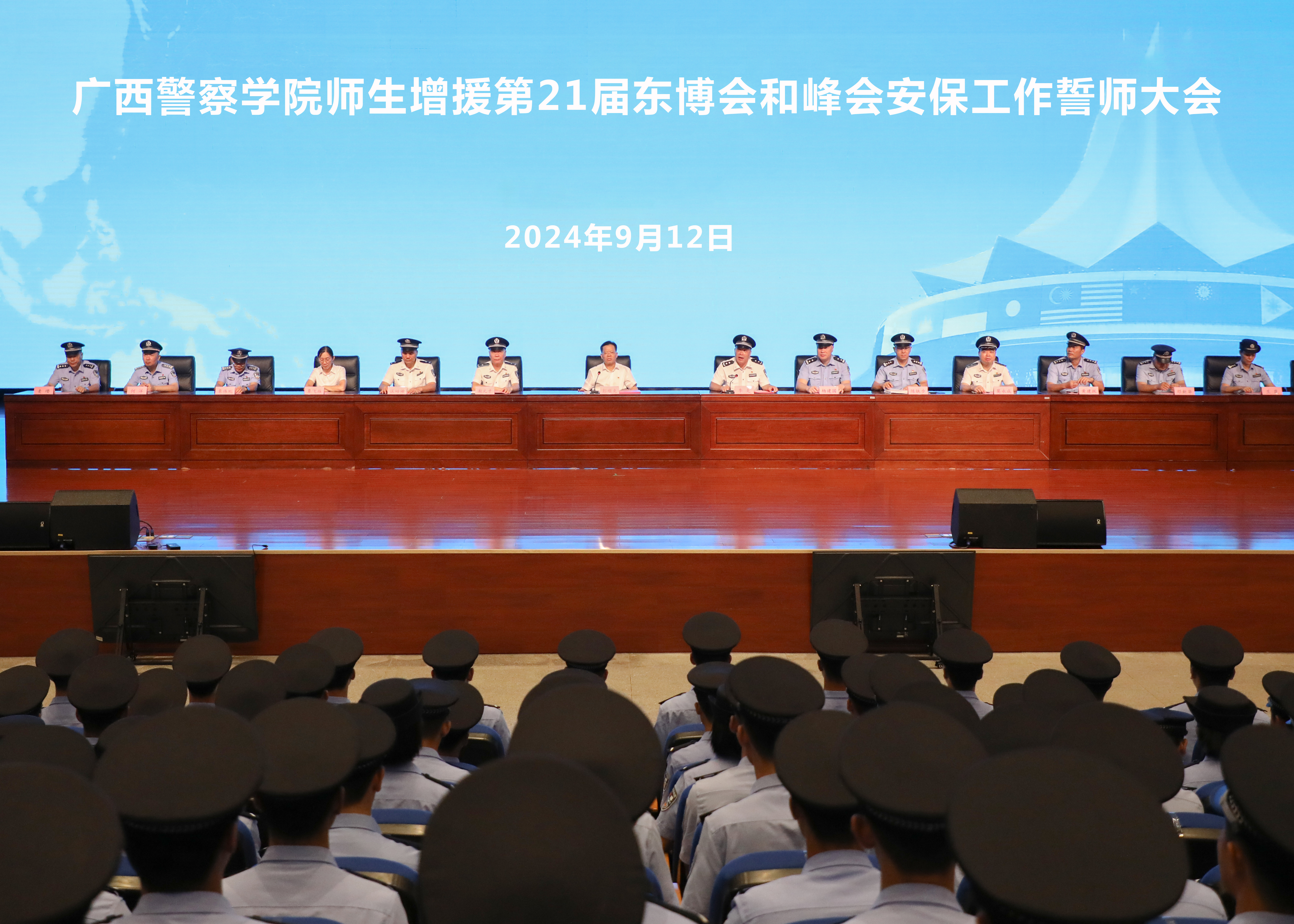 为提振士气,鼓舞斗志,全力确保学校师生圆满完成第21届中国—东盟博览会、中国—东盟商务与投资峰会各项安保任务,9月12日晚,学校在仙葫校区学术报告中心召开第21届东博会、峰会安保誓师大会。学校党委书记彭顺克出席大会并讲话,大会由副校长李克主持。南宁市公安局特警支队副支队长杨建国出席大会。