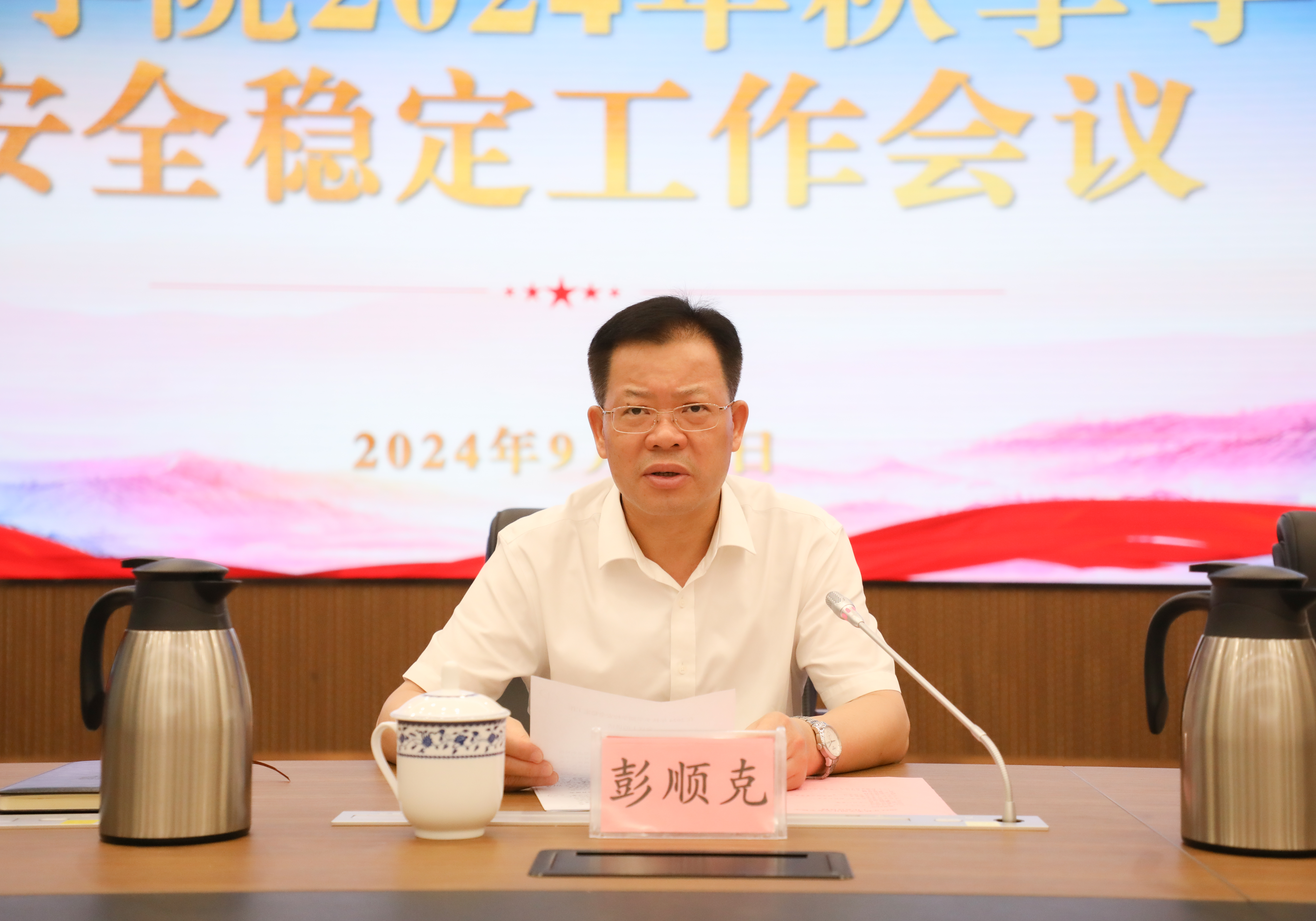 彭顺克对扎实做好学校保安全、防风险、护稳定各项工作进行部署,他提出3点要求:一是提高政治站位、扛起政治责任,切实增强做好安全稳定工作的责任感和紧迫感。坚持系统思维、筑牢安全底线,发挥好公安院校在维护校园安全稳定方面的示范引领作用,营造安全稳定的校园环境。二是坚持问题导向、突出重点任务,全面开展安全稳定风险隐患排查整治。全校各部门要密切协同配合、加强防范管理、形成工作合力,下大力气从严从实从细抓好排查整治,加强师生安全教育,落实好有关制度,全面消除各领域风险隐患。三是加强组织领导、完善体制机制,压实扣紧安全稳定工作责任链条。各单位要切实扛起安全责任,畅通信息上报渠道,严肃追责问责,以“时时放心不下”的责任感将安全稳定工作落实到位。