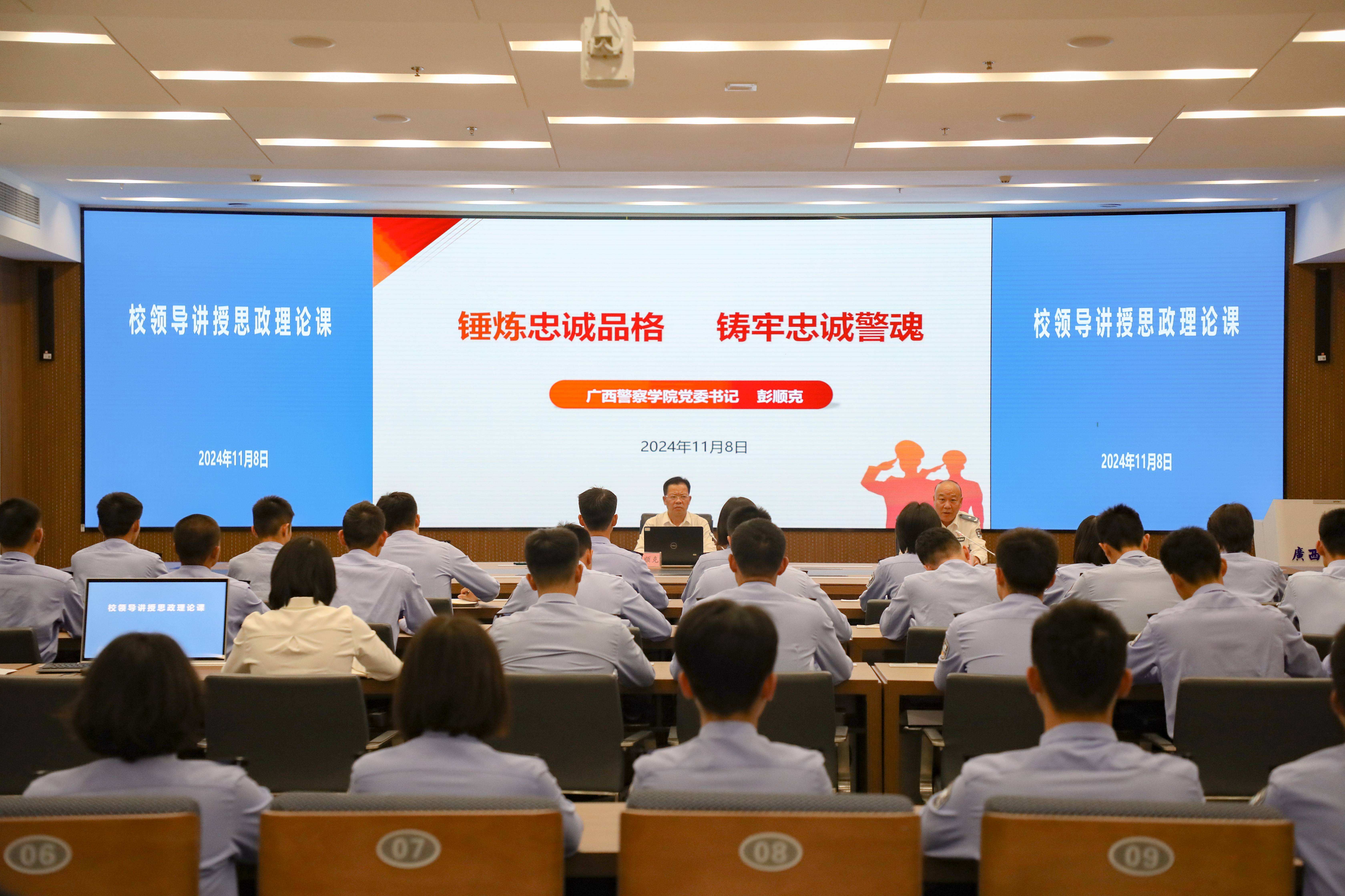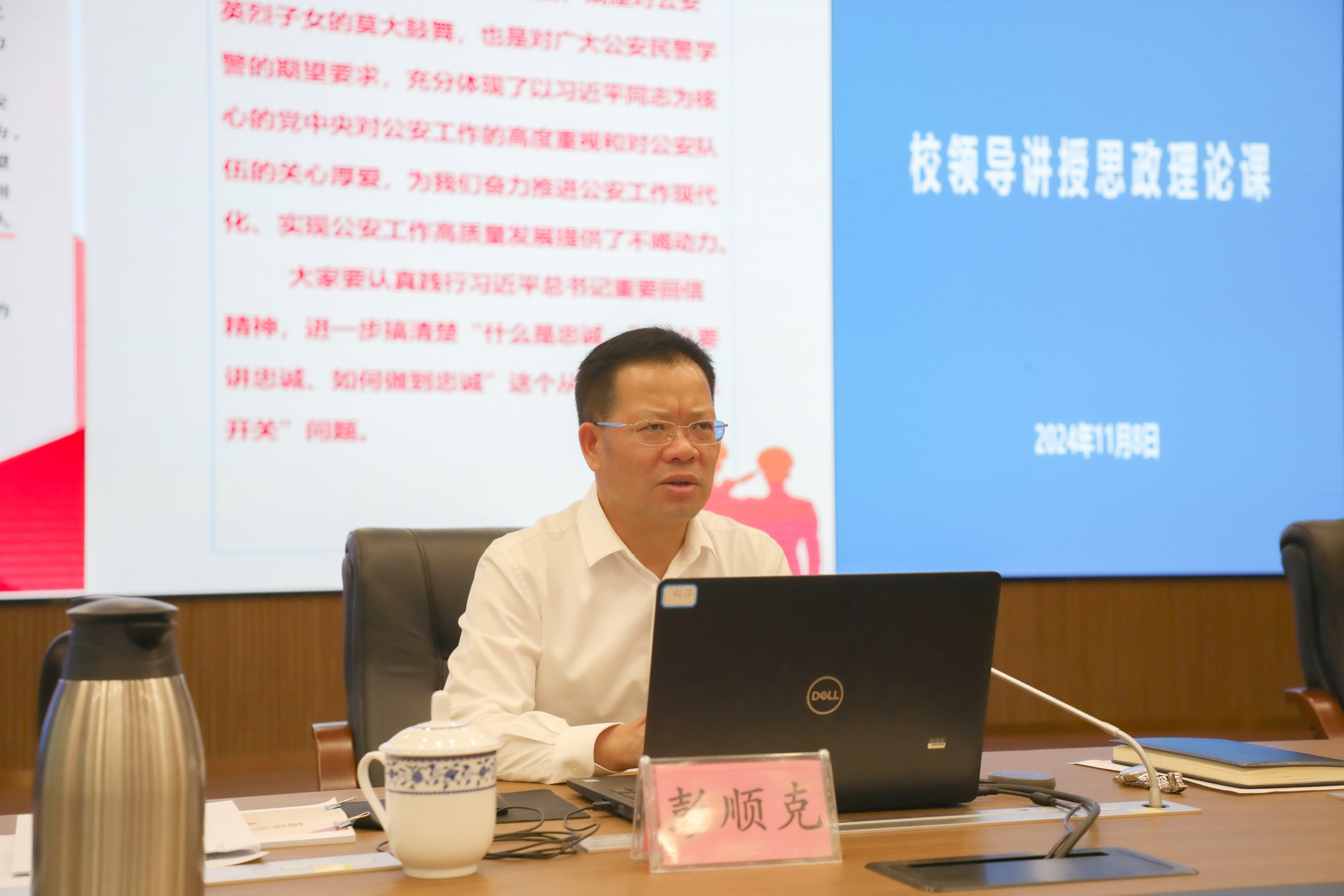 为深入学习贯彻习近平总书记关于学校思政课建设的重要指示精神,贯彻落实新时代学校思政课建设推进会精神,坚持不懈用习近平新时代中国特色社会主义思想铸魂育人,11月8日,学校党委书记彭顺克在仙葫校区智慧公安研训基地为学生讲授思想政治理论课。
