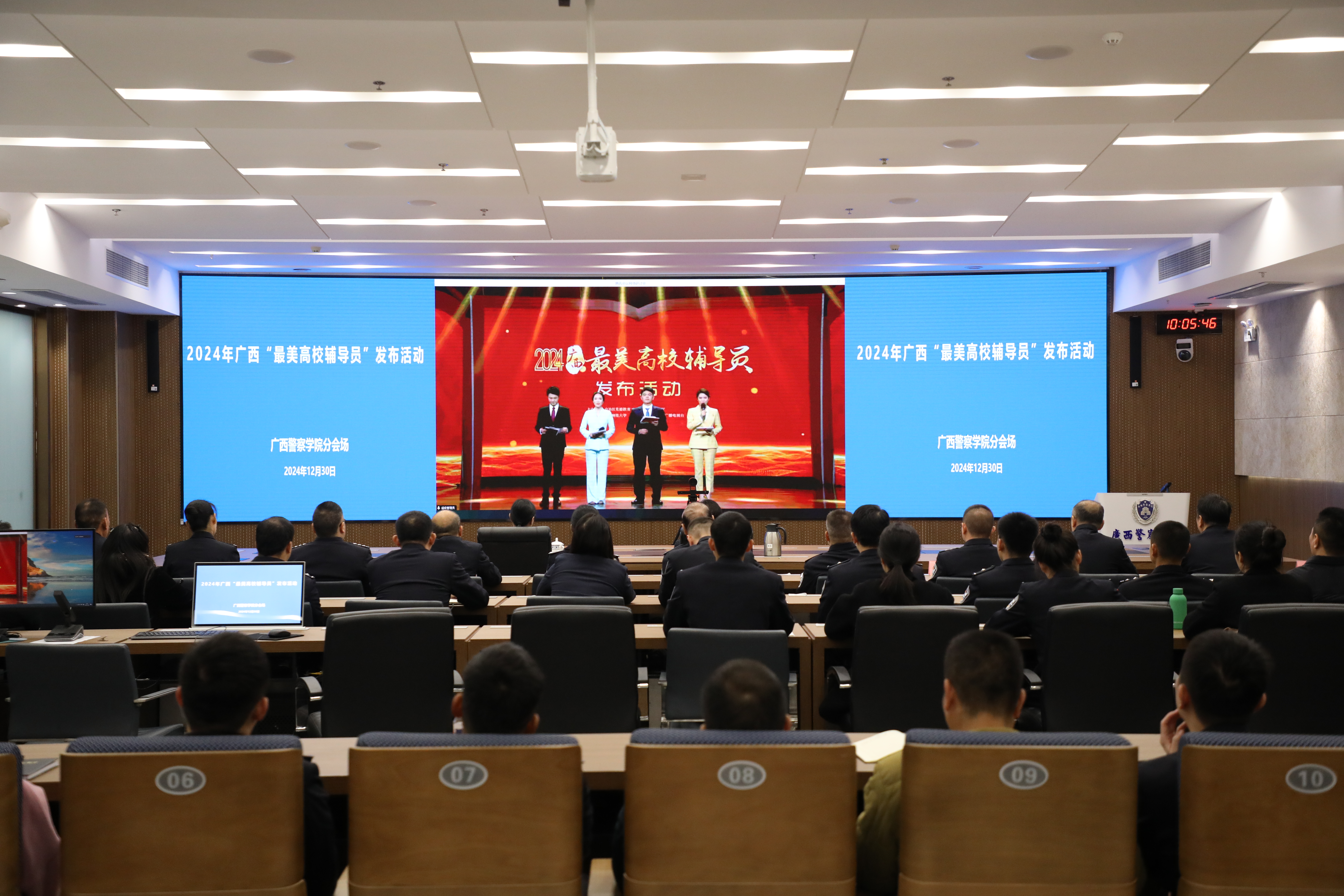 12 月 30 日,2024年广西最美高校辅导员发布活动在南宁举行。活动由广西壮族自治区党委教育工委、自治区教育厅共同举办,旨在展现新时代广西高校辅导员的精神风貌,激励广大辅导员坚守育人初心、担当育才使命。beat365官网在仙葫校区智慧公安研训基地设分会场,校党委书记彭顺克,校党委委员、总会计师叶露出席分会场活动。
