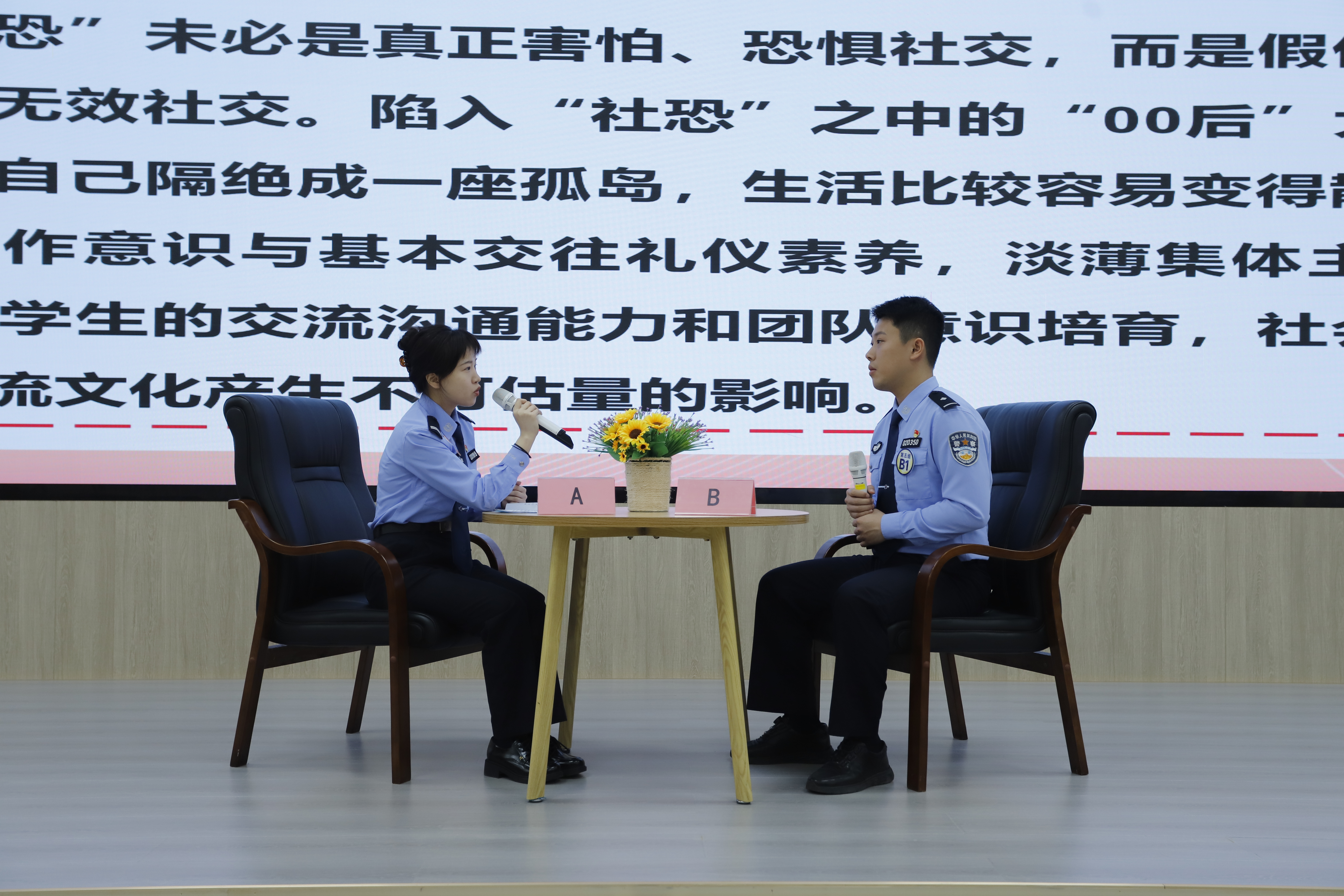 决赛设置案例研讨、谈心谈话两个环节。案例研讨环节题目涵盖辅导员九大工作职责,聚焦大学生思想政治教育热点与难点问题。选手两人一组,围绕抽取的案例,共同辨析问题,探讨对策,总结规律,在“你来我往,一问一答”中,由表及里、步步深入,考察辅导员运用理论分析、研判、解决问题的综合能力和逻辑思维能力。