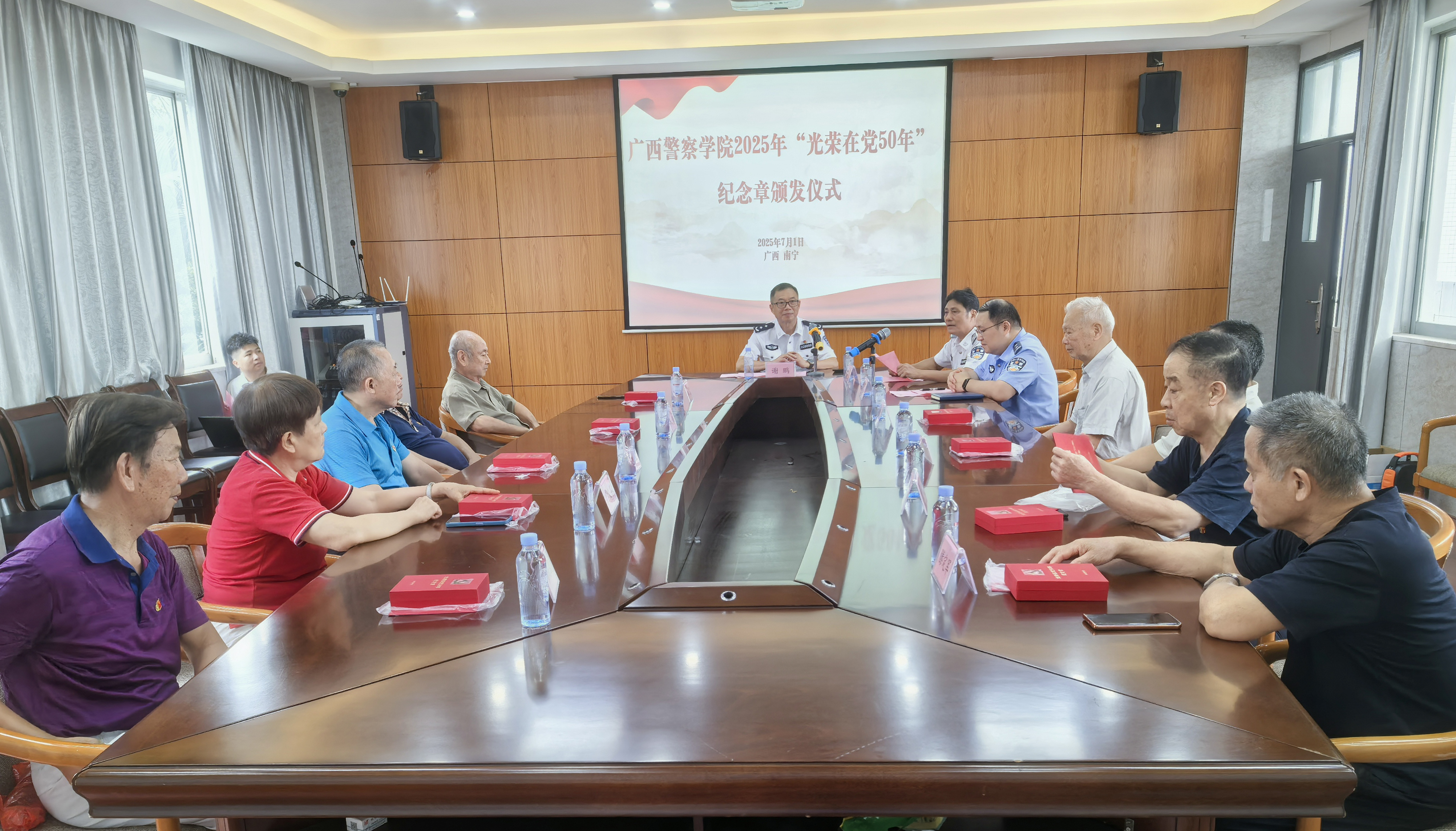 7月1日,在中国共产党迎来104周年华诞之际,学校在长湖校区404会议室举行2025年“光荣在党50年”纪念章颁发仪式,学校党委委员、副校长谢鹏出席仪式。