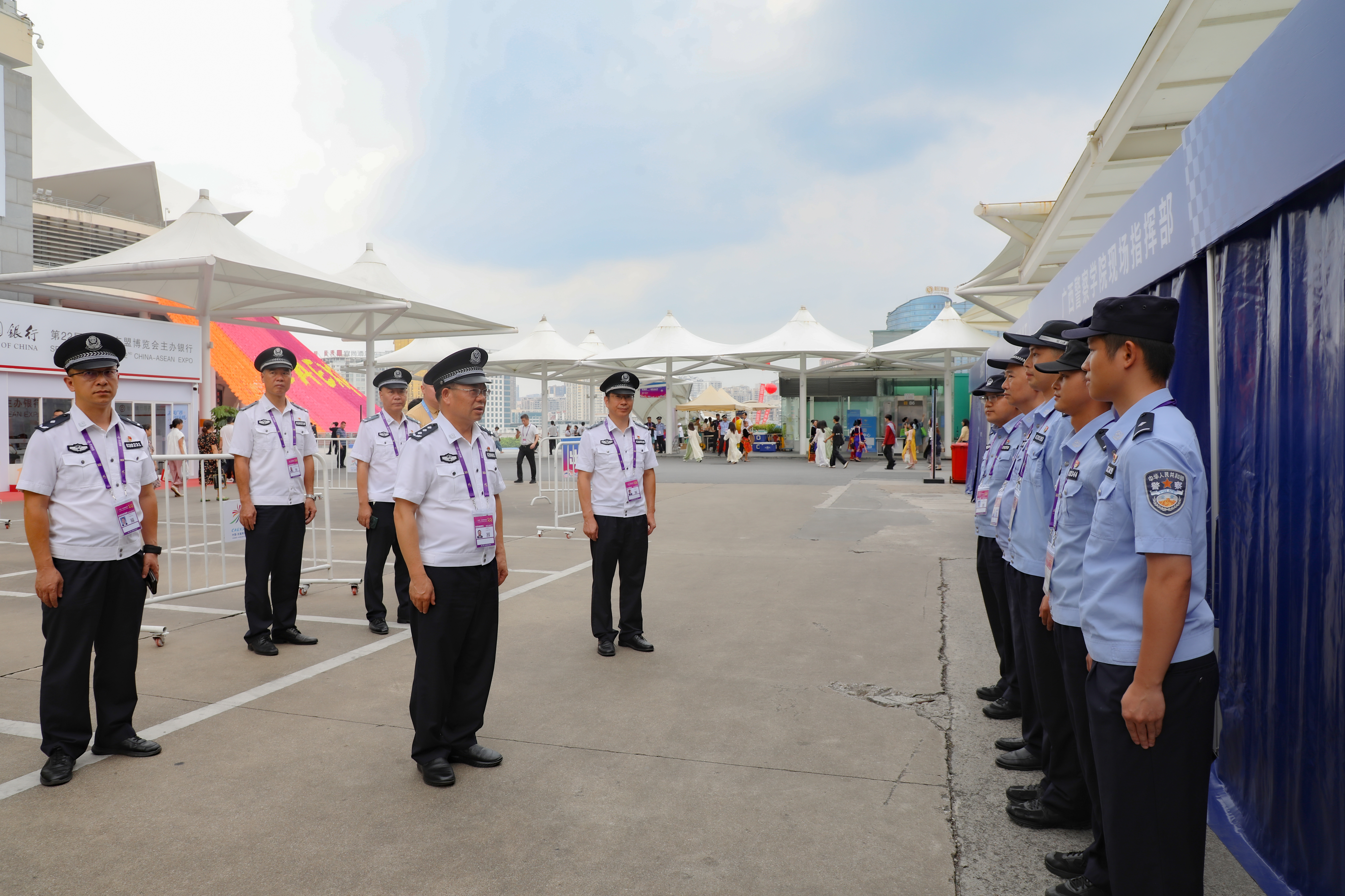 彭顺克、张军来到南宁国际会展中心的执勤点,实地检查指导师生执勤工作,详细了解了安检、人员部署和后勤保障等工作情况,向带队民警表示感谢,并与执勤师生进行交流。