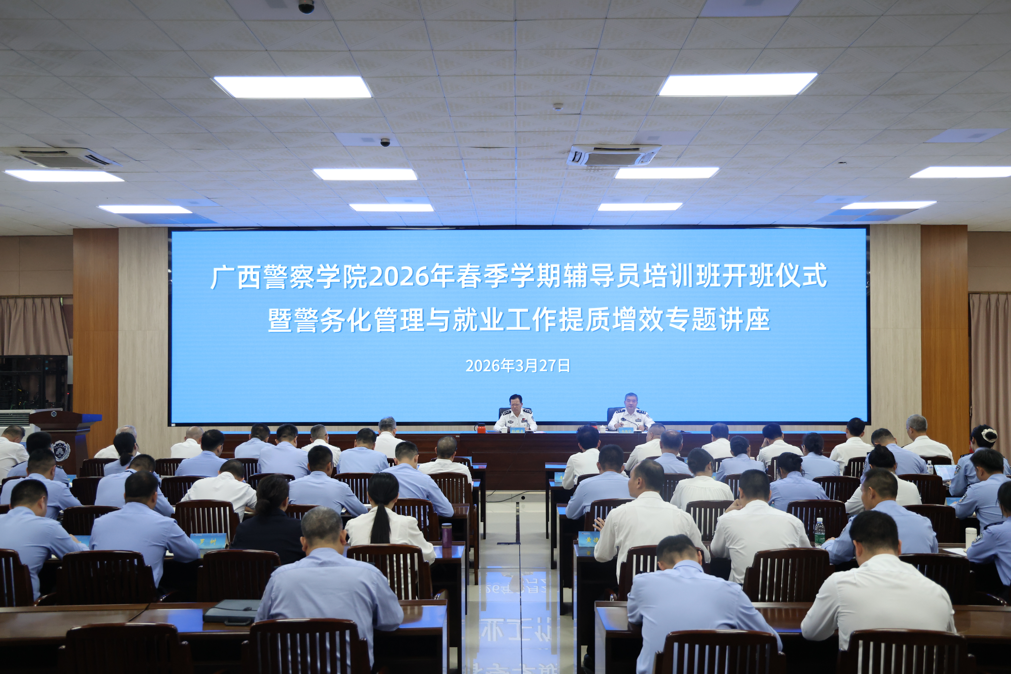 为强化辅导员队伍建设、补齐警务化管理短板、攻坚毕业生就业工作难题,切实筑牢公安院校育人根基,3月27日下午,学校在仙葫校区图书馆403多功能报告厅举办2026年春季学期辅导员培训班开班仪式暨警务化管理提质增效专题讲座。学校党委书记彭顺克出席仪式并作专题讲座,校党委委员、副校长韦岗宁主持开班仪式。