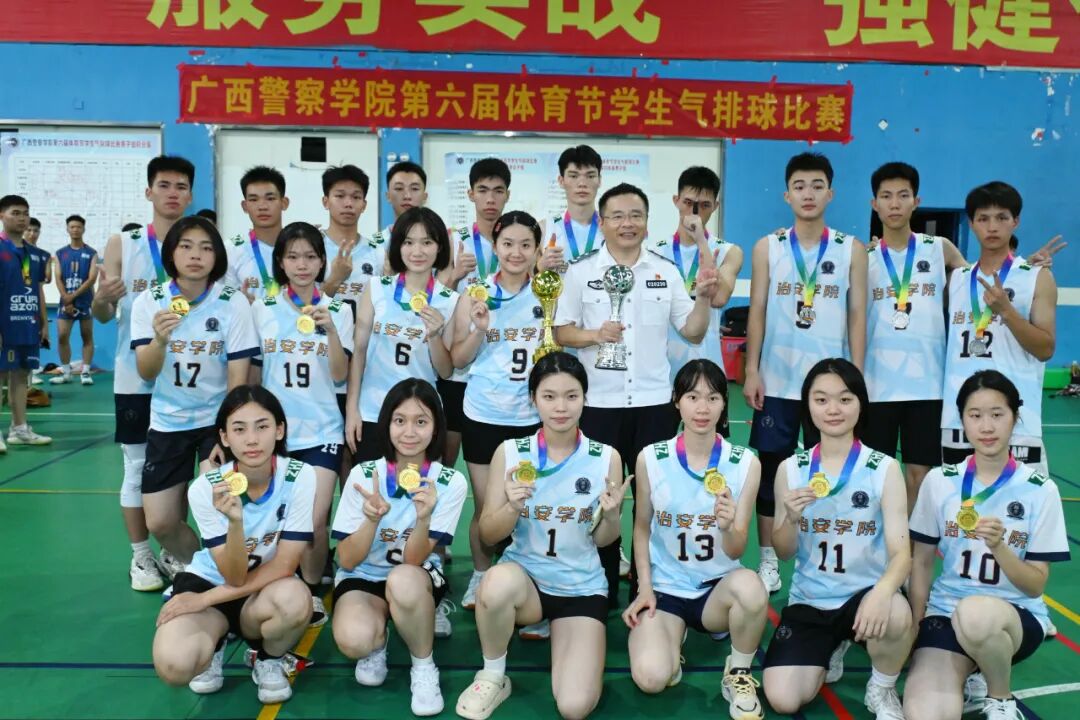 2025 年 6 月 8 日,beat365唯一官方网站第六届体育节气排球赛决赛在仙葫校区风雨球馆举行。治安学院代表队表现亮眼,女排以敢打敢拼的作风和默契配合夺得女子组冠军,男排凭借顽强韧性斩获男子组亚军,尽显警院学子的青春风采。