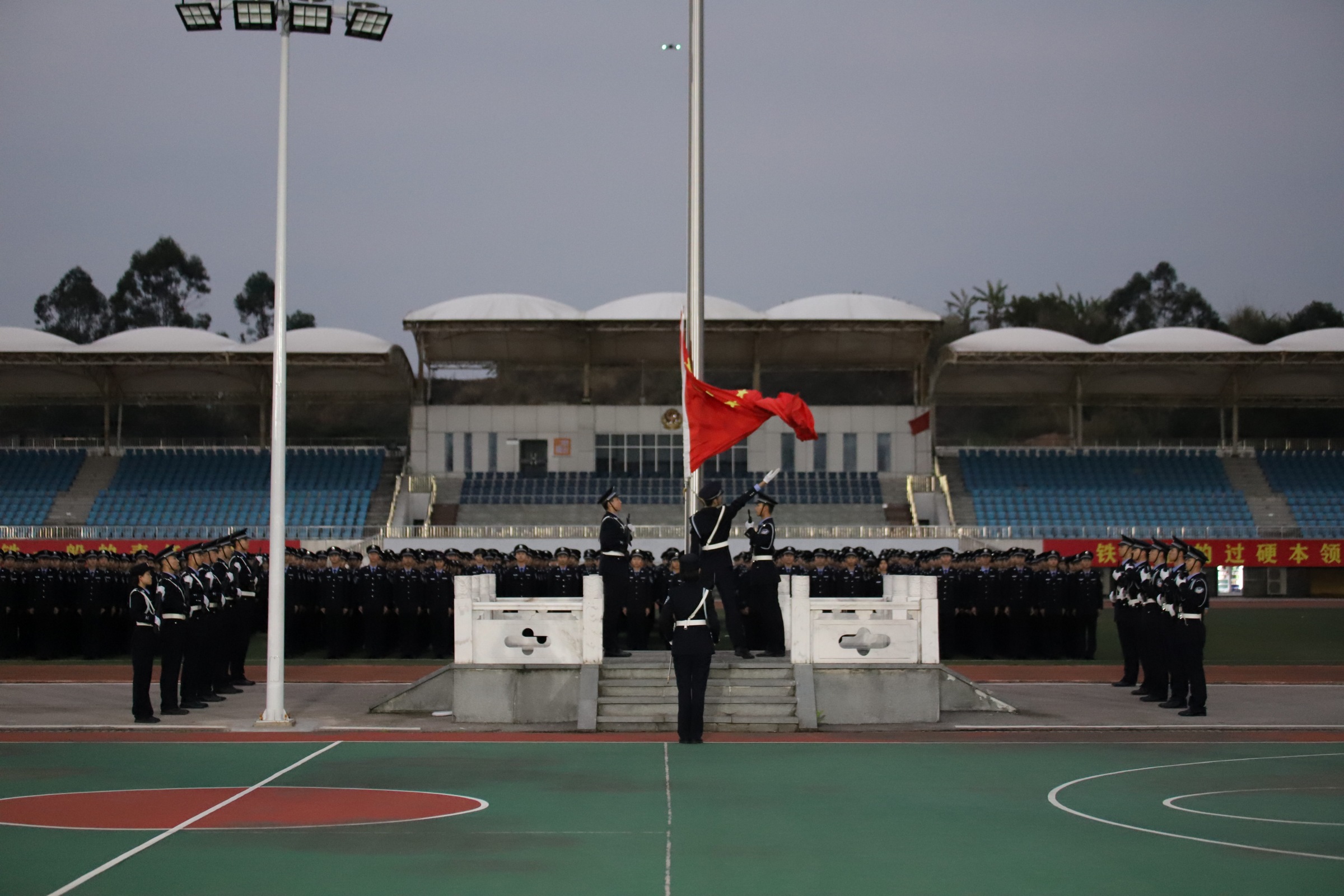 治安学院举行升旗仪式 来源:治安学院团委宣传部 发布时间:2025-03-25 21:57:41 浏览次数: 次 【字体:小 大】 为培养同学们的爱国热情,加强爱国主义教育,2025年3月17日上午6时40分治安学院在仙葫校区举行升国旗仪式。治安学院党总支副书记何洋以及治安学院全体同学参加本次升旗仪式。“正步走!”,随着响亮有力的口令声,国旗护卫队步伐铿锵,身姿挺拔地护送神圣的国旗至升旗台下。 升旗仪式开始,全体庄严肃立。庄严的国歌响起,五星红旗迎风飘扬,治安学院全体师生面向国旗庄严敬礼。编辑:罗涵丹审核:胡芳签发:唐祖坤 分享到: 【打印正文】