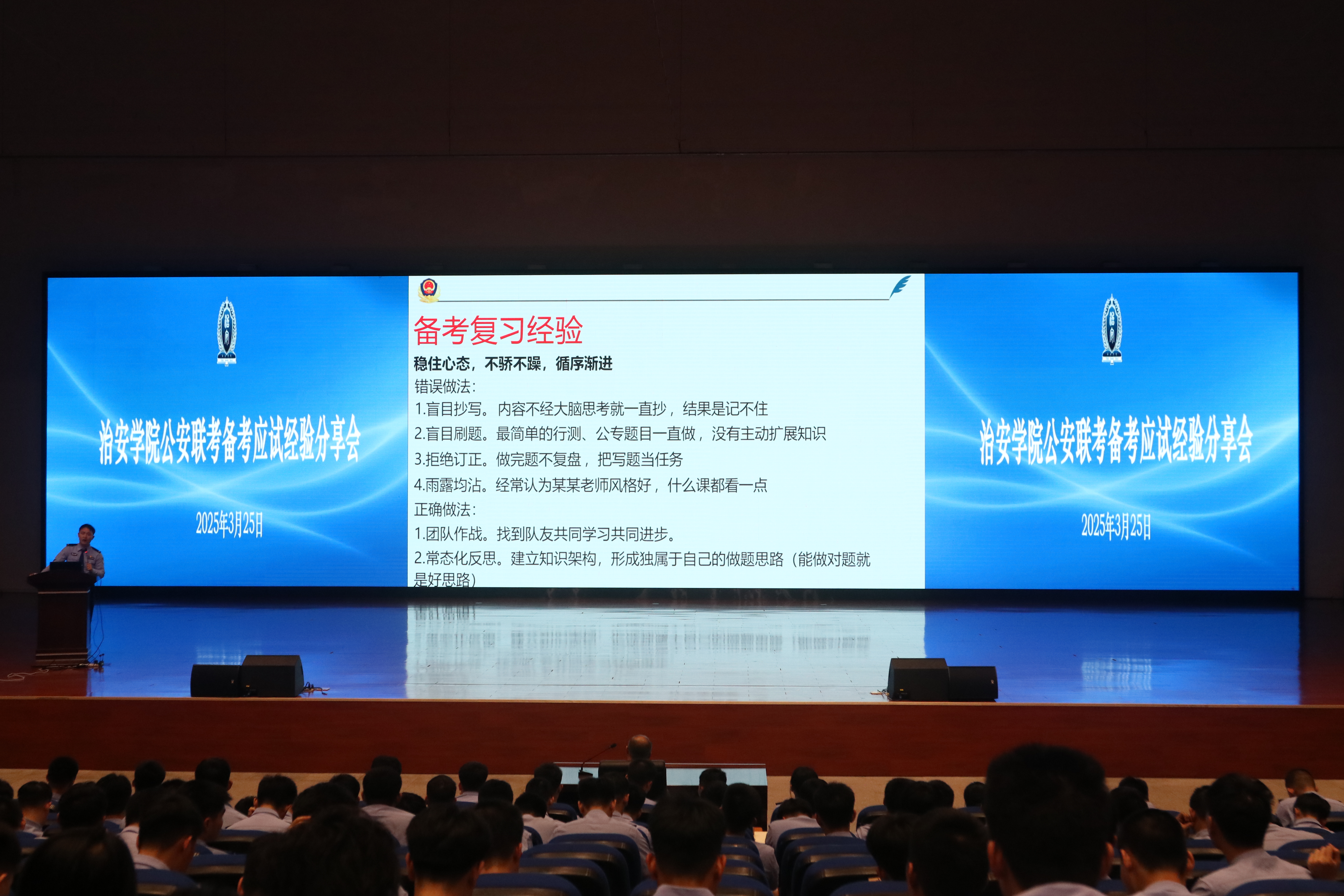 2025年3月25日下午,beat365唯一官方网站治安学院在仙葫校区学术报告中心举办公安联考备考应试经验分享会,由治安学院党总支副书记何洋主持会议,2022、2023、2024级全体同学参会。
