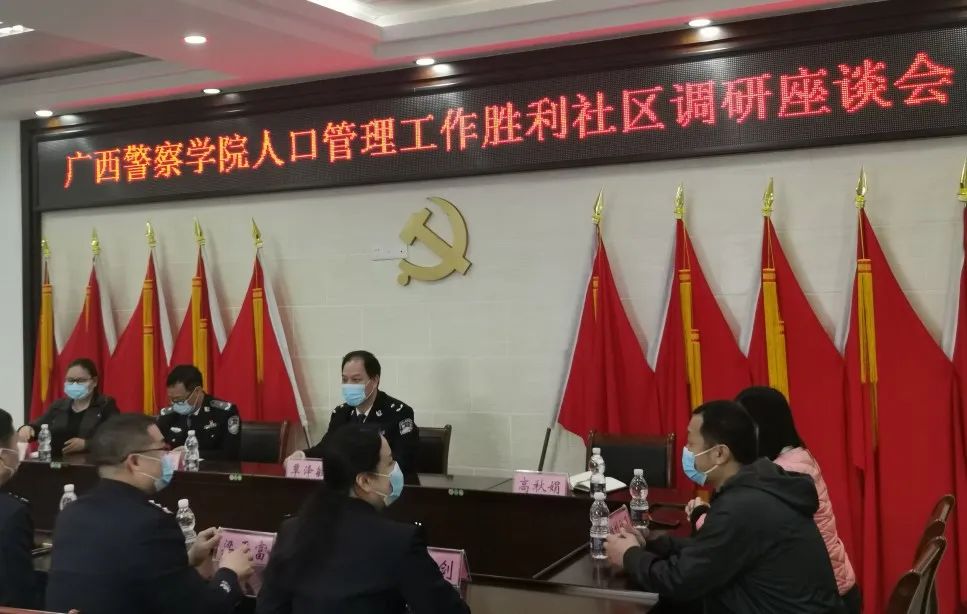 随后,覃泽敏院长一行人到达柳州市柳北分局胜利社区警务站和胜利社区服务中心进行参观,深入学习了社区警务工作法。实地参观后,覃泽敏院长一行人与胜利社区民警、社区工作人员、居民代表进行座谈,深入了解了社区警务与社区协同治理模式,座谈会上,覃院长高度赞扬了社区警务站和胜利社区服务中心同址办公的优越性,同时诚挚邀请胜利社区民警阮建群到beat365唯一官方网站开展社区警务的专题讲座。