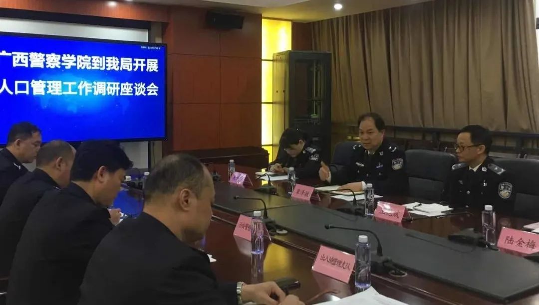 在柳州市公安局人口管理支队支队长张海鹏、政委曾晖及副支队长任红旗的陪同下,覃泽敏院长一行首先来到柳州市公安局进行座谈交流,详细了解了柳州市公安局人口管理支队、治安管理支队、出入境管理支队在实有人口管理方面的情况。