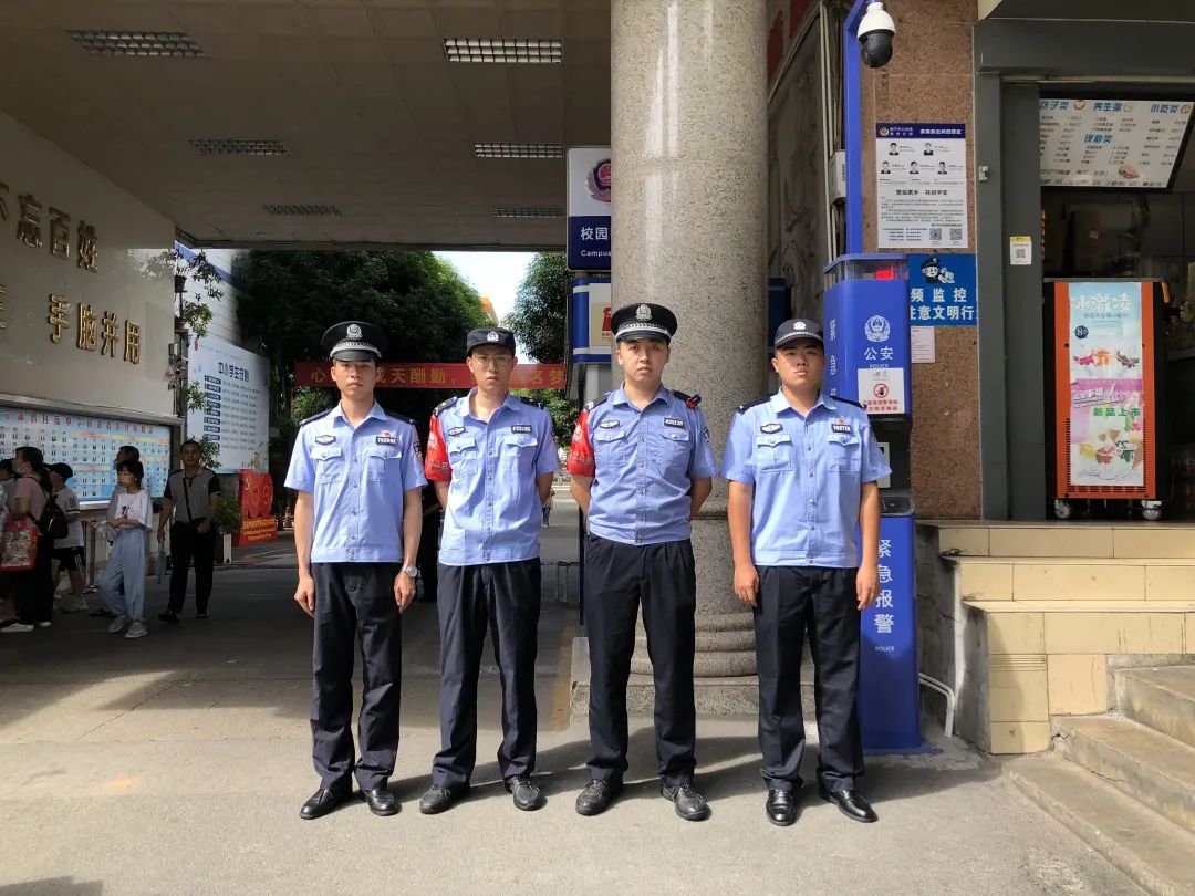 新城派出所增援学警蒋宇杰、殷圣凯、廖芸翎、蔡馨莹协同民警为辖区中学中考护航。