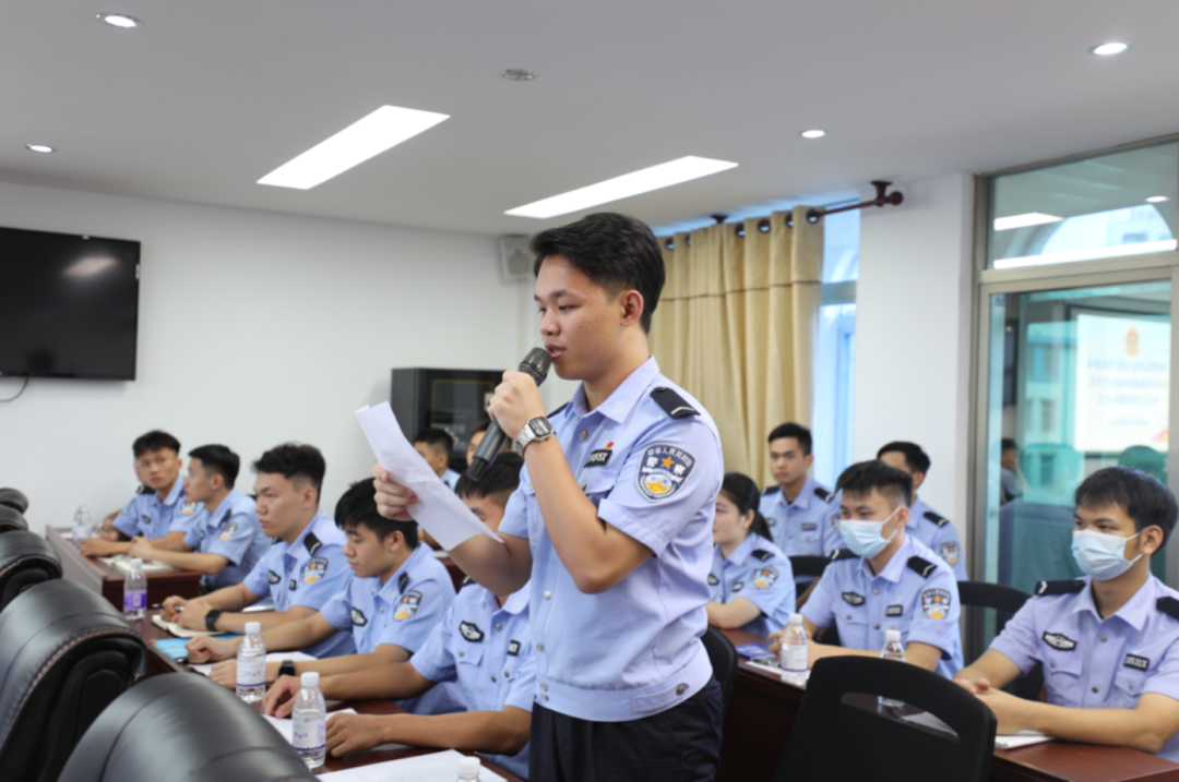 座谈会上,实习生组长周炎汇报治安学院北海实习点三十五名实习生两个半月以来的实习情况。