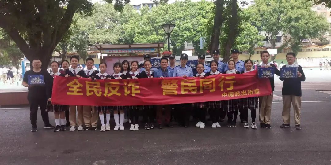 反诈宣传结束后龙城中学的学生自告奋勇跟中南派出所的张自强教导员以及民警和实习警进行合影留念