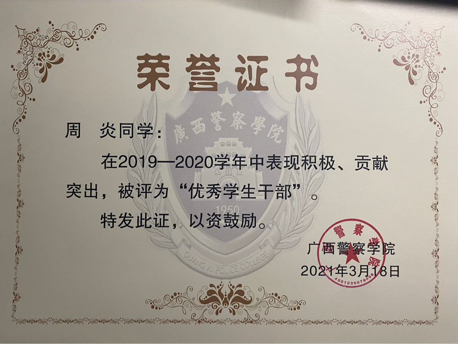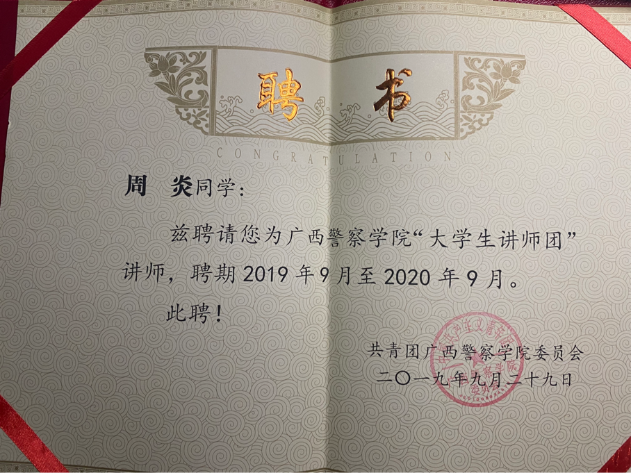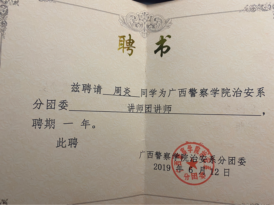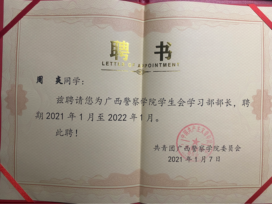 现任校学生会学习部部长、治安学院团委组织部副部长、治安学院讲师团团长