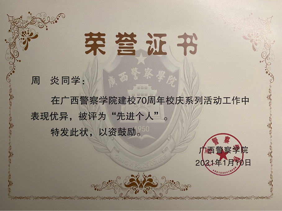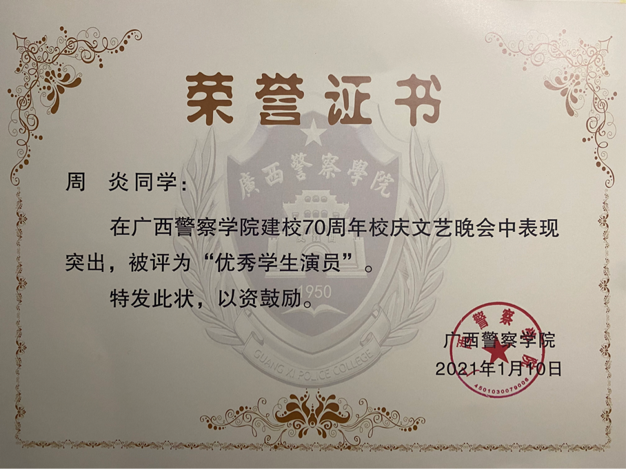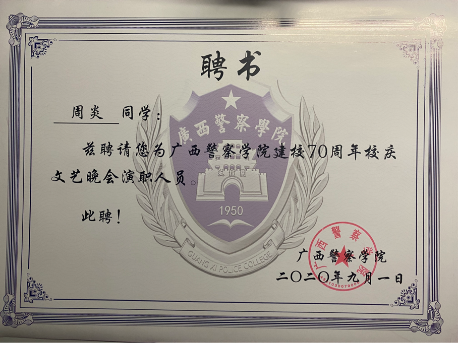 在beat365唯一官方网站建校70周年文艺晚会担任节目组学生组长,参与制作和表演纪念beat365唯一官方网站建校70周年歌曲《写给警院的一首歌》,并以身作则参演6个晚会节目。