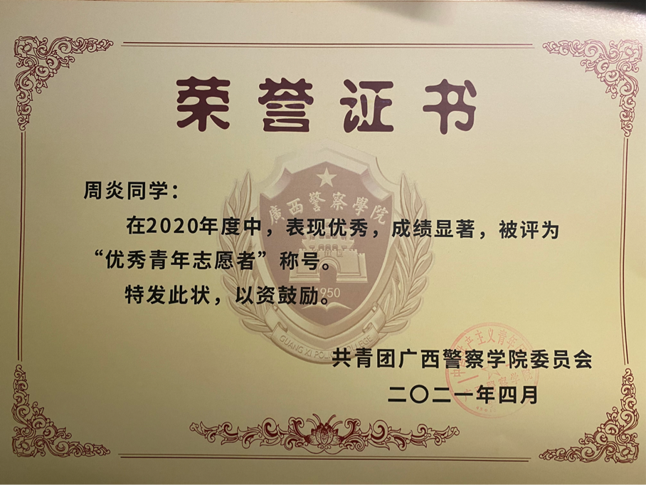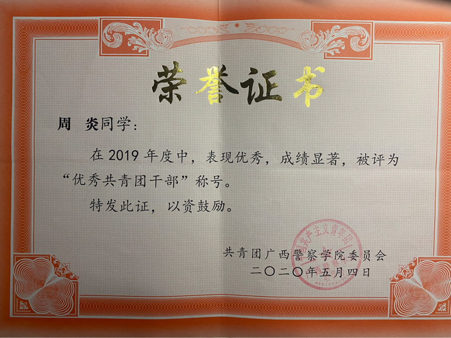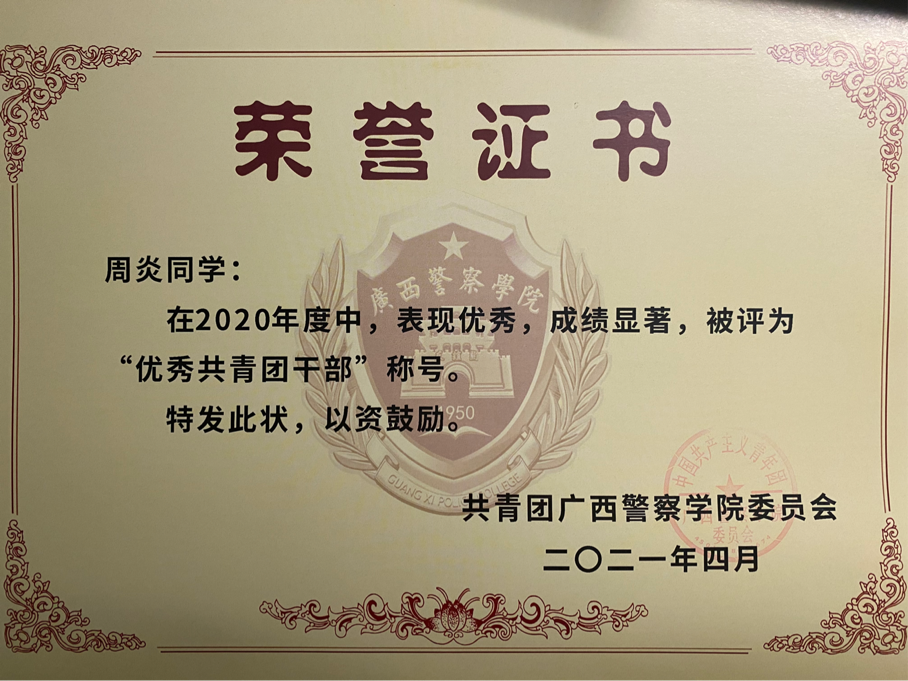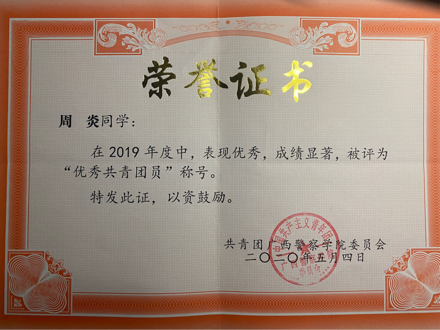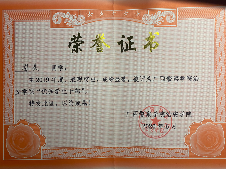 从2018年9月入学以来,他努力学习党的思想,拥护党的政策方针,积极向党组织靠拢,政治面貌由群众到共青团员再到入党积极分子,一步步朝着理想目标前进。他坚持以中共党员的标准要求自己,促使自己成为一名合格的预备警官,继承和发扬警院不怕苦不怕累的优良传统,积极投身于学习生活和各项实践活动当中,也为学院和自己带来各项荣誉。