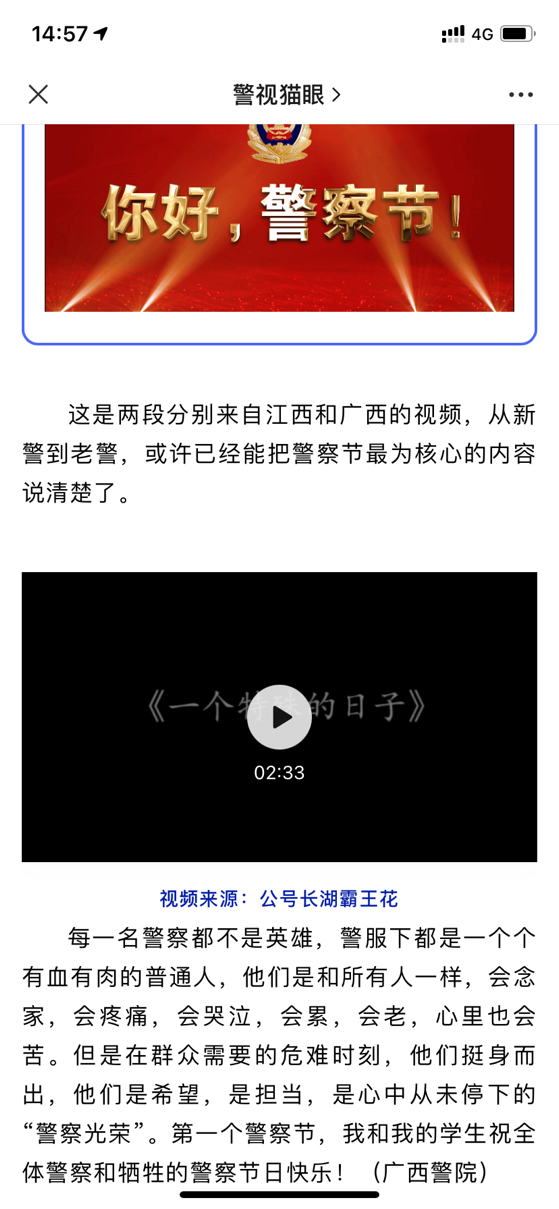 在中华人民共和国首个人民警察节自制庆祝视频《一个特殊的日子》在网络平台一经发布便获得警院同学老师的认可与喜爱,经警察自媒体长湖霸王花和警视猫眼评论转发,收到来自全区乃至全国范围的公安干警夸奖与鼓励。