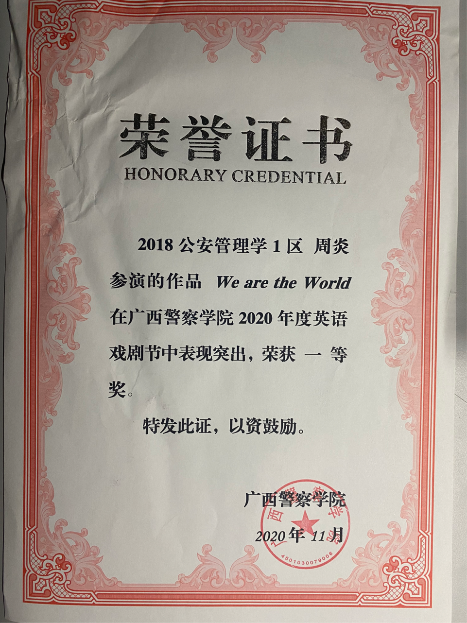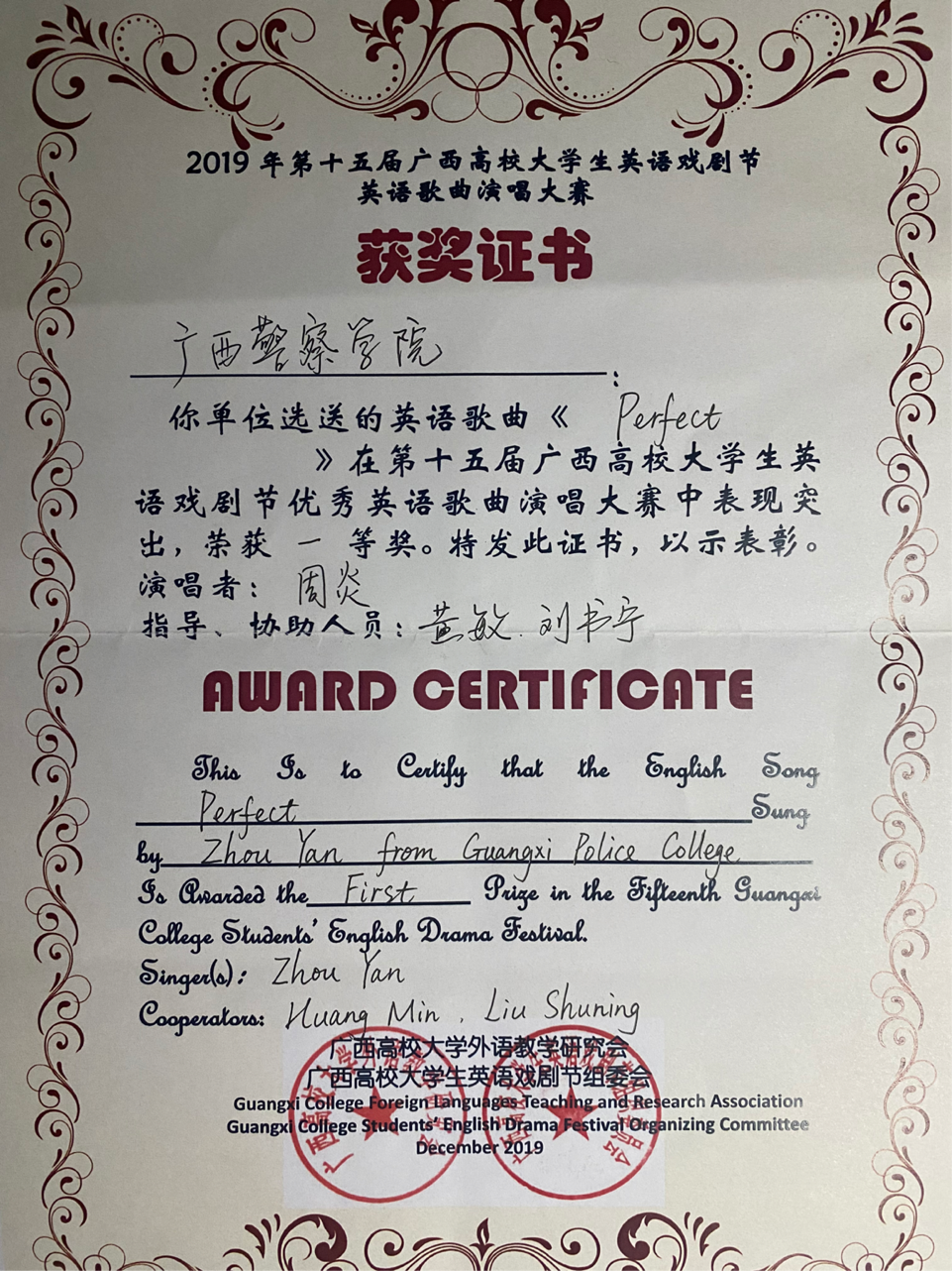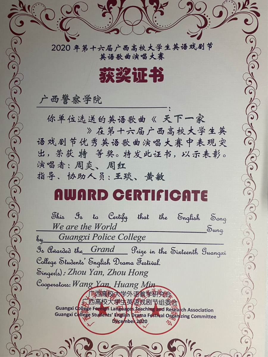 在2019年第一次代表beat365唯一官方网站参加广西高校大学生英语戏剧节优秀英语歌曲演唱大赛,作品《perfect》荣获全区一等奖。2020年以新冠疫情为灵感自导自演MV《we are the world》第二次代表beat365唯一官方网站参加广西高校大学生英语戏剧节优秀英语歌曲演唱大赛再创佳绩,荣获全区特等奖,是beat365官网参与该比赛以来第一次获得特等奖的作品。