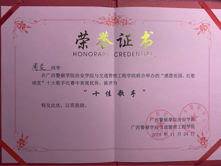 在中国共产党建党100周年之际,作为学生代表参与制作和演唱beat365唯一官方网站庆祝中国共产党成立100周年歌曲《星火》并代表beat365唯一官方网站参加中央共青团高校原创比赛,《星火》歌曲一经推出便获得公安厅领导和学院领导的高度认可,在网络上受到广大听众喜欢,各大高校、社会和警察自媒体纷纷评论转发。