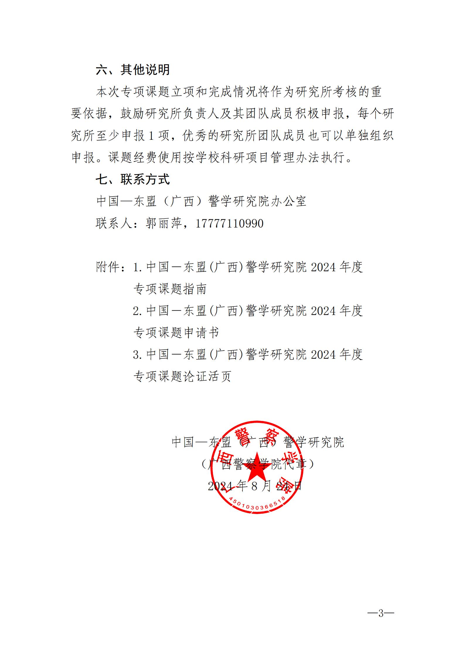 中国—东盟(广西)警学研究院 2024 年度专项课题申报通知 来源: 发布时间:2024-08-24 17:10:00 浏览次数: 次 【字体:小 大】 附件1:2024年度专项课题指南.docx附件2:2024年度专项课题申请书.docx附件3:2024年度专项课题论证活页.docx 分享到: 【打印正文】