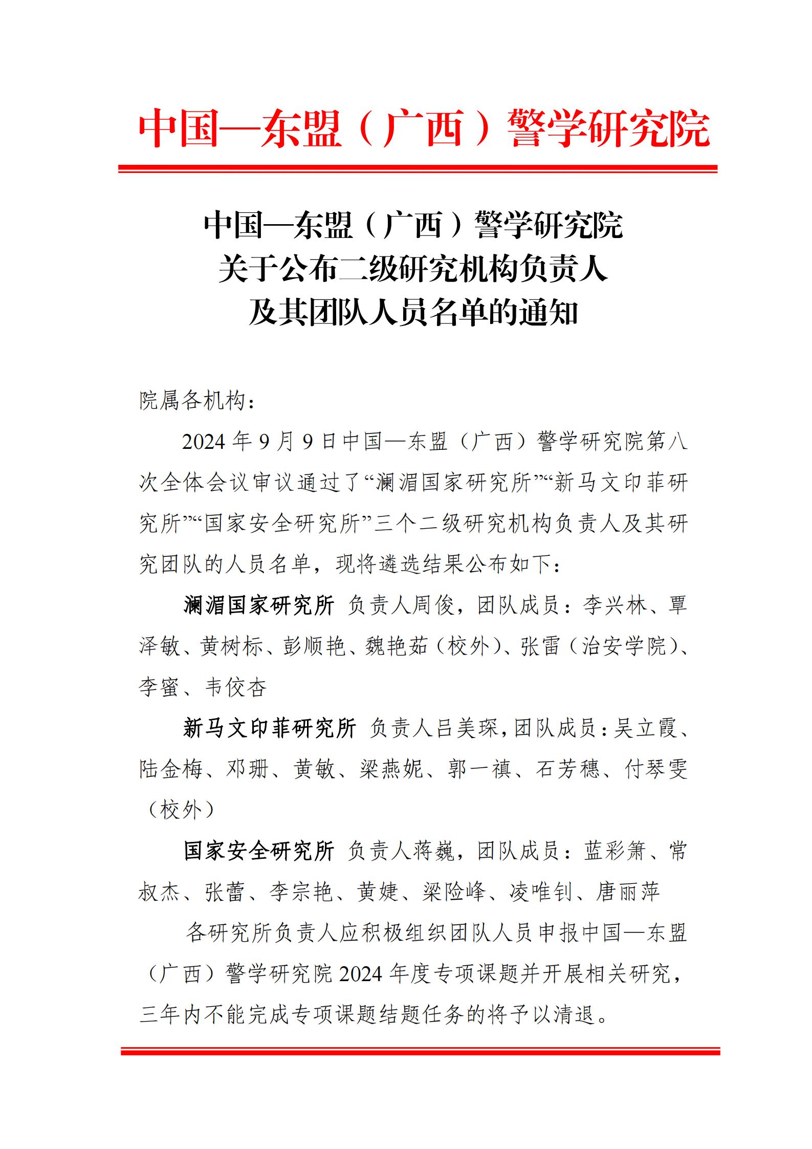 中国—东盟(广西)警学研究院 关于公布二级研究机构负责人 及其团队人员名单的通知