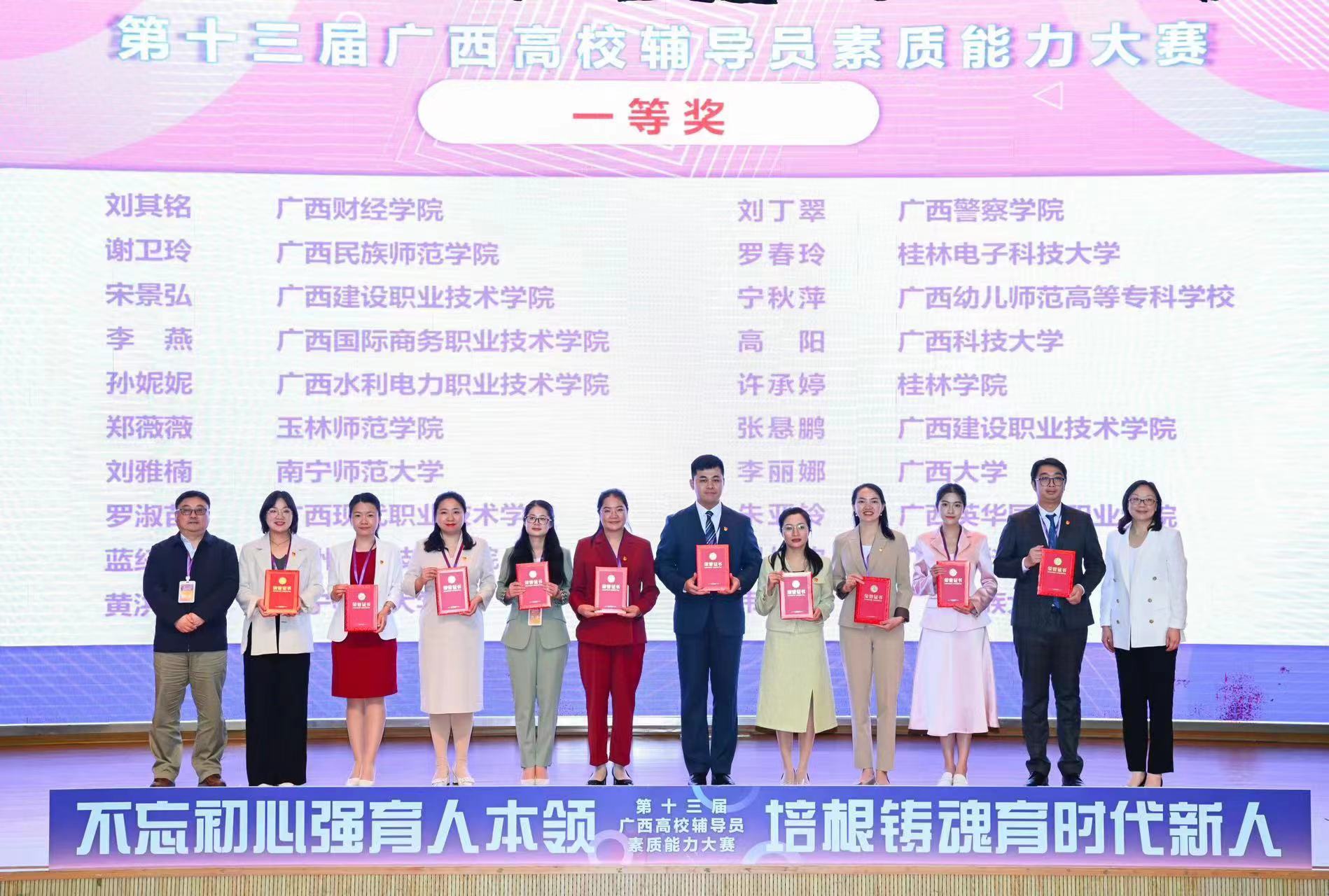 教师刘丁翠(右三)获第十三届广西高校辅导员素质能力大赛一等奖