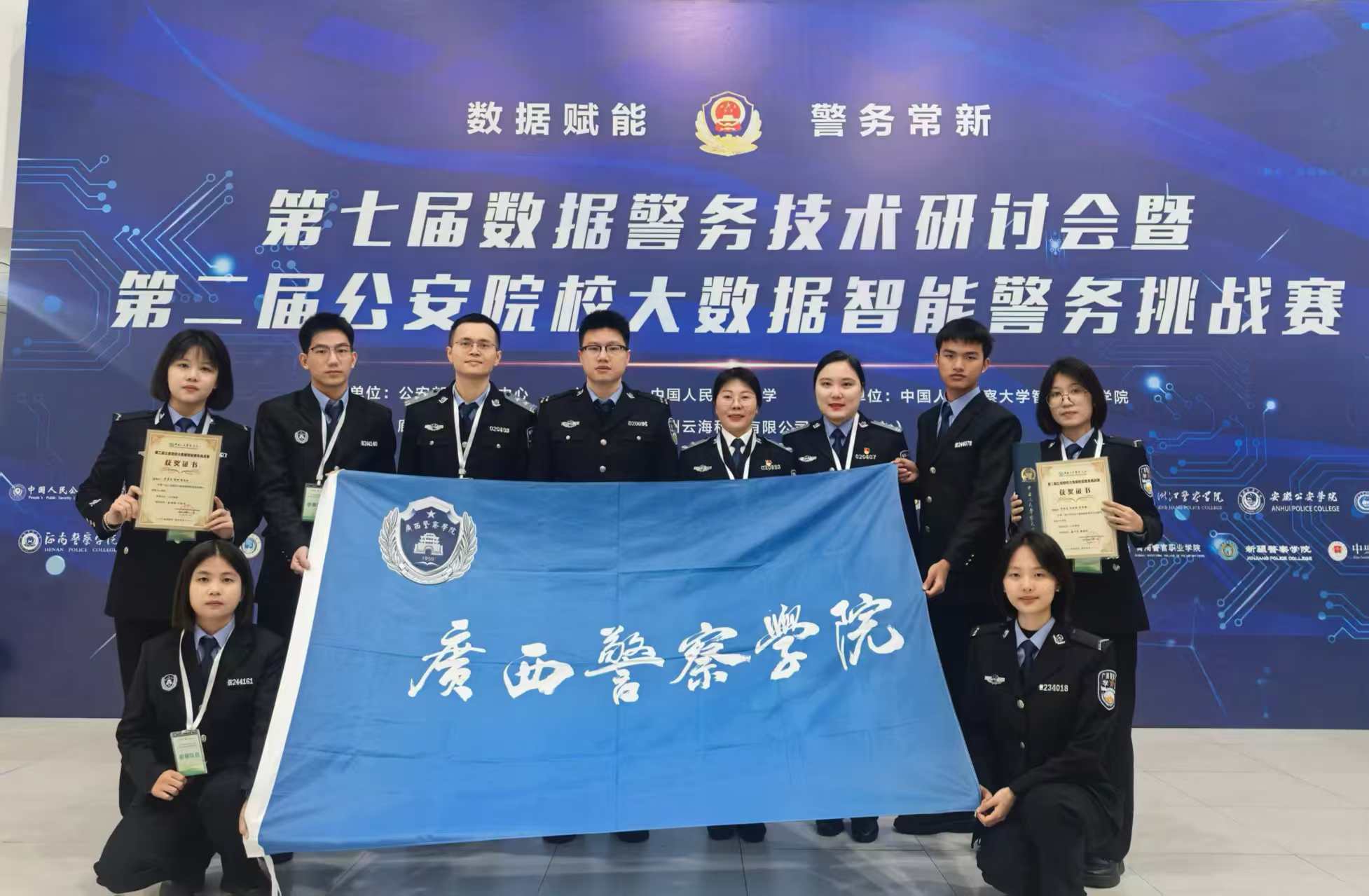 学院在原有网络安全与执法、信息安全专业基础上,积极适应数字警务发展需求,增设数据科学与大数据技术、数据警务技术(公安本科)专业,新增大数据技术、人工智能、数字侦查等4个教研室及大数据应用研究中心。公安大数据技术应用、网络安全与执法入选校级重点建设学科。2024年,学院通过自治区党委网信办“广西网络安全人才培养基地”认定,依托该平台深化产学研用一体化教学,学生在广西公安系统职业技能竞赛、网络安全攻防实战演练等各类网络安全竞赛中屡获佳绩。2025年,公安智能大数据专业群获广西普通本科高校产教融合专业群建设立项,获620万元经费支持。