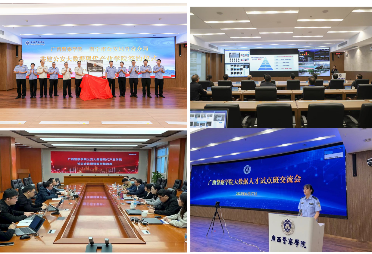 2021年,学院与苏州科达科技股份有限公司、中国联合网络通信有限公司广西分公司合作共建公安大数据现代产业学院,获评广西首批本科高校示范性现代产业学院。与南宁市公安局青秀分局共建“公安大数据联合创新实验室”“数字警务联合创新研究中心”,与苏州科达共建“校企联合实验室”“公安大数据联合研发中心”,实现校局企协同育人新突破。