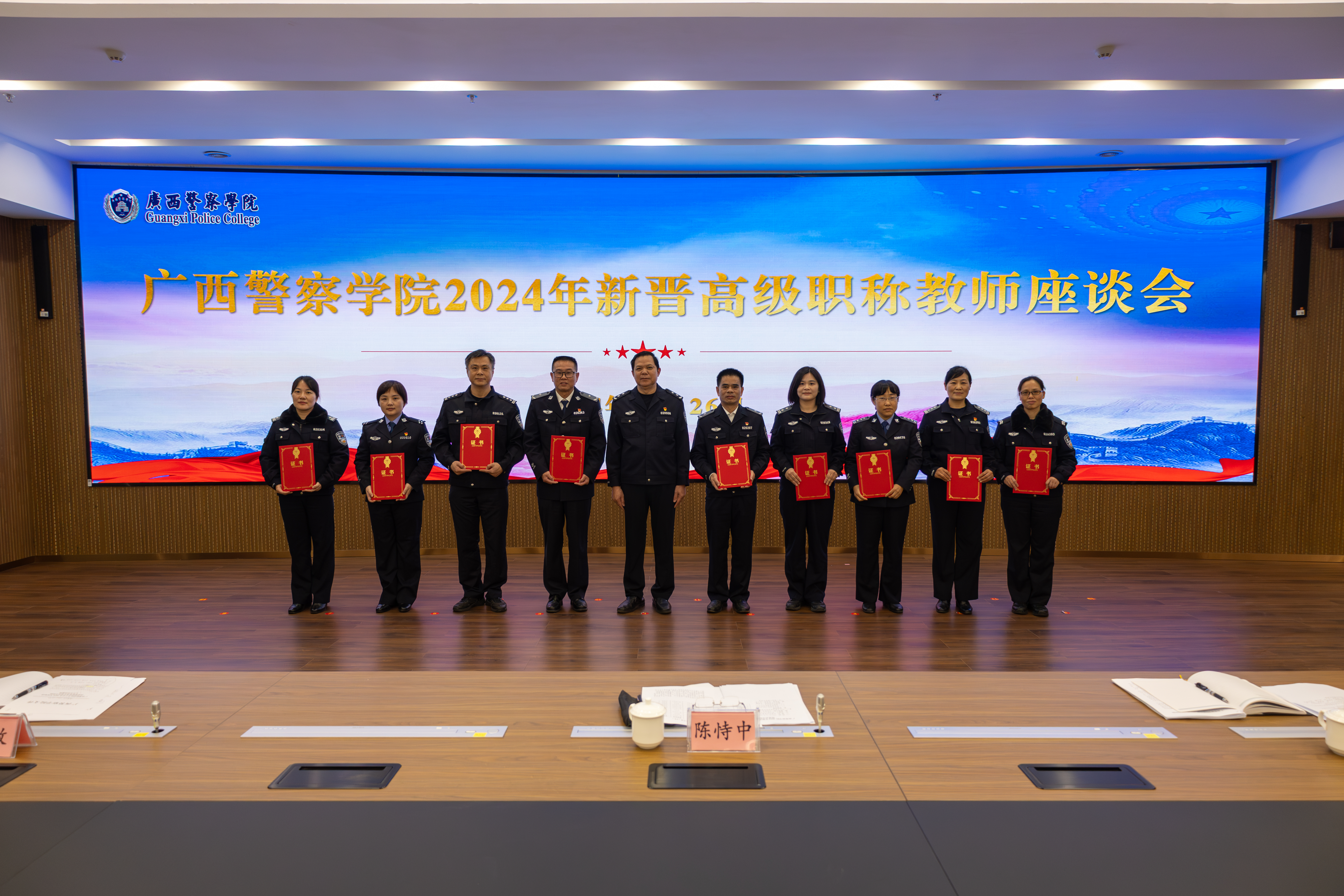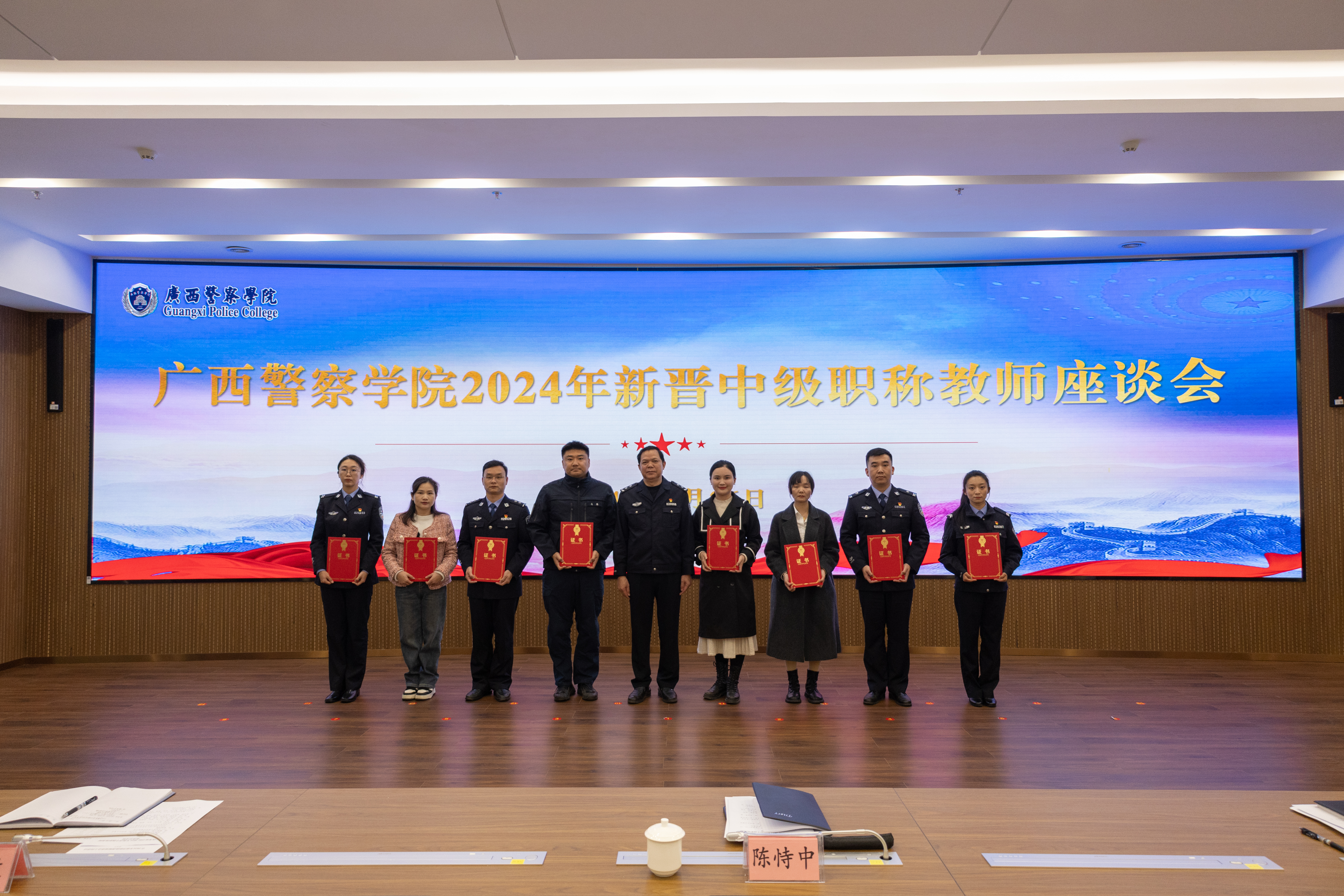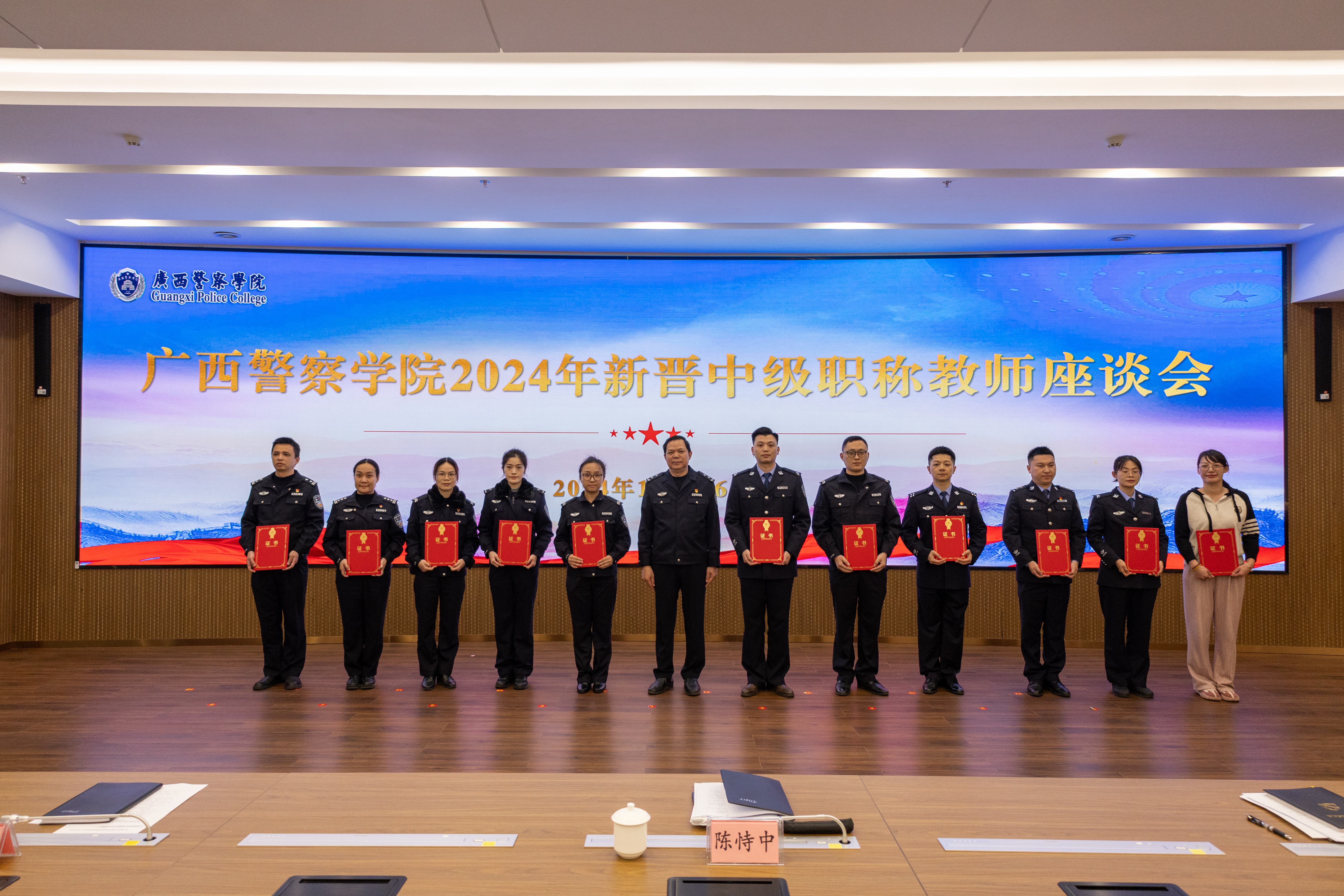 陈恃中对新晋职称教师表示热烈祝贺,勉励大家在新起点上开启新征程,不忘教育初心,牢记育人使命,始终保持进取精神,不断提高自身素质,为学校高质量发展贡献智慧和力量。陈恃中向大家提出三点希望:一要争做教书育人的带头人。要弘扬践行教育家精神,做教书育人的行家里手。要践行OBE教育理念,建设有生命力、有深度思考的课堂。要关心关爱学生,助力学生成长。二要争做科学研究的领头人。要遵守学术规范,争做恪守学术诚信、遵循学术准则的模范。要强化有组织科研,努力在更高层次上取得新成果,为广西经济社会发展作出警院新贡献。三要争做师德师风建设的践行人。要以身作则,成为学生健康成长的指导者和引路人。要遵守职业道德规范,不越师德师风“底线”“红线”“高压线”。要不断提升自身的学识水平和业务能力,努力成为学生心中的“四有”好老师。