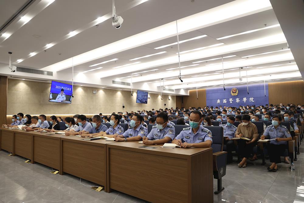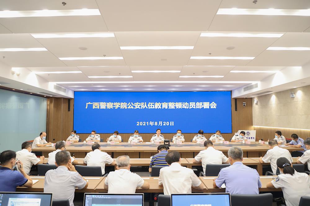 8月20日上午,学校在仙葫校区智慧公安研训基地召开公安队伍教育整顿动员部署会议。会议坚持以习近平新时代中国特色社会主义思想为指导,深入贯彻习近平法治思想和习近平总书记“七一”重要讲话精神,以及对广西工作系列重要指示精神,全面贯彻落实全国、公安部、全区和公安厅第二批队伍教育整顿动员部署会要求,对做好学校第二批队伍教育整顿进行动员部署。在校校领导覃干超、张军、颜静、何品荣、刘建昌、李克、陈恃中和叶露出席会议,学校党委书记覃干超作动员讲话,党委副书记、校长张军主持会议。